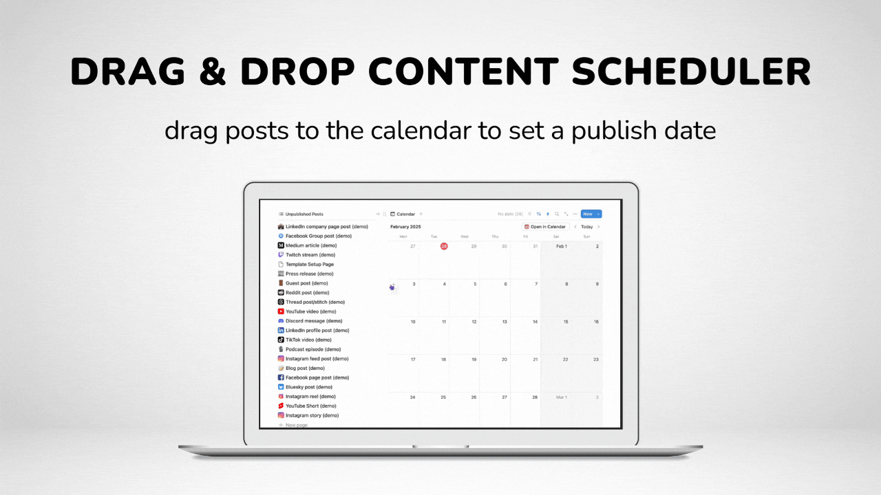 - ⚙️ Content scheduler — Drag and drop your posts onto the calendar to quickly set publish dates and visualize your publishing schedule.