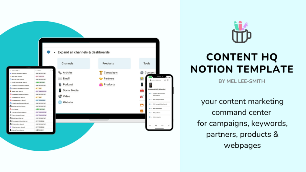 Content HQ is designed by Mel Lee-Smith, experienced marketing manager and Notion consultant who’s worked with dozens of clients over an 8+ year career.