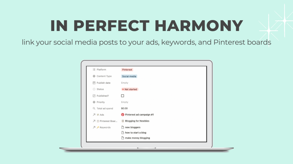 Click a post template to create a new Notion page with the page icon and database properties automatically applied. Each template also includes content creation checklists so you don’t miss a single step. Templates available for Facebook, Instagram, TikTok, Twitter, Pinterest, and LinkedIn.