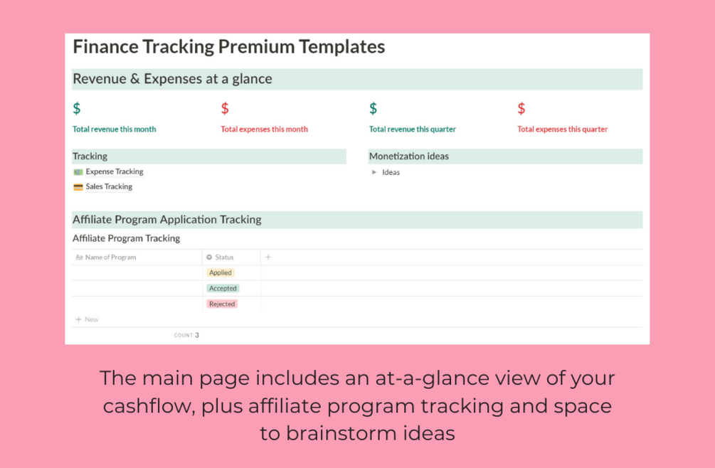The Blog Finance Tracking Bundle is designed to work with the Notion for Blogging Premium Template Pack, which includes 75+ pages and templates to manage every element of your blog and brand. Check out the Premium Template Pack (which includes everything you see here and so much more!) on Gumroad.
